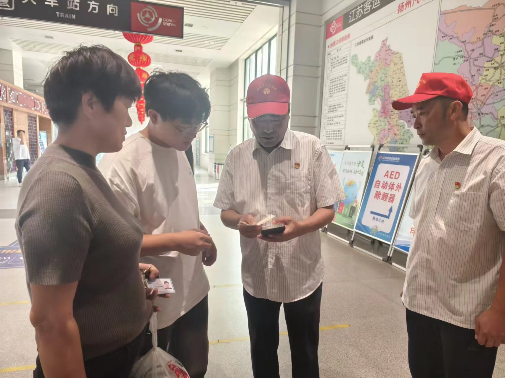 志愿者們有序在車站的售票廳、候車廳、安檢處、發(fā)車平臺等崗位為旅客提供文明勸導、秩序維護、行李搬運、茶水服務(wù)等志愿服務(wù),并耐心解答旅客的每一個問題,細心指引旅客前往購票窗口、候車區(qū)、檢票口等關(guān)鍵位置,確保每一位旅客都能順利、愉快地踏上旅程。針對老弱病殘孕等重點旅游群體,志愿者們熱情為其提供“一對一”重點幫扶,全力保障旅客群體安全便捷出行。在揚州汽車站候車大廳、汽車東站服務(wù)臺均設(shè)立了黨員示范崗,黨員志愿者們亮明身份,主動接受旅客監(jiān)督。